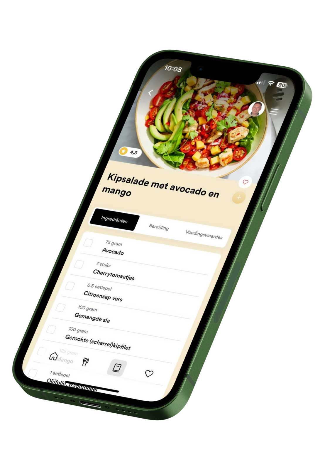 Dagelijks zet de voedingsapp maaltijden voor je klaar. Zin in iets anders? Met een druk op de knop staat er een alternatief, of zoek zelf een recept tussen de ruim 1500 recepten, naar een maaltijd waar je zin in hebt! Ook kun je eigen favoriete maaltijden samenstellen.